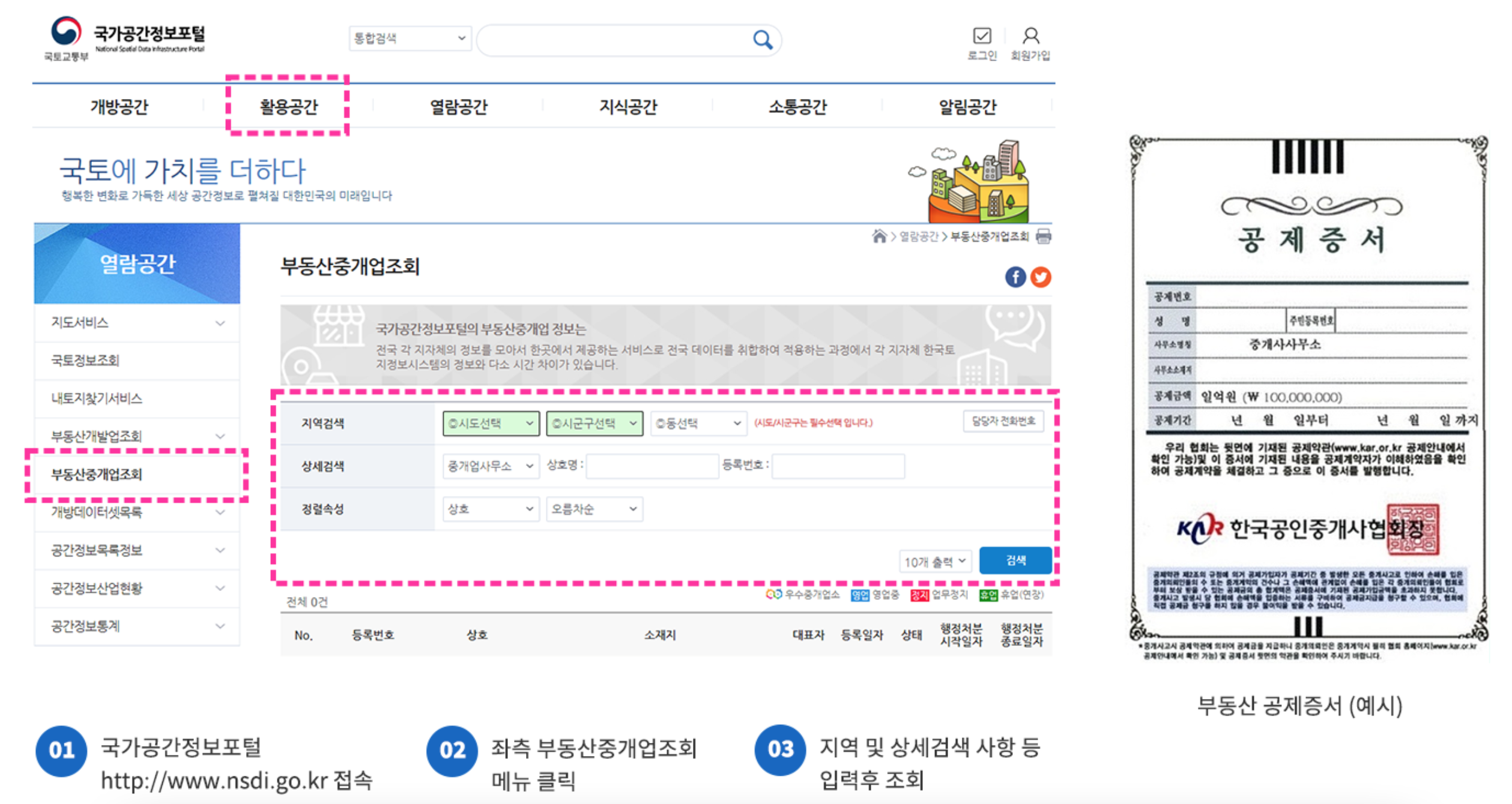 국가공간정보포털(http://nsdi.go.kr)에서 부동산중개업을 조회하면 부동산 공제증서를 확인할 수 있습니다.