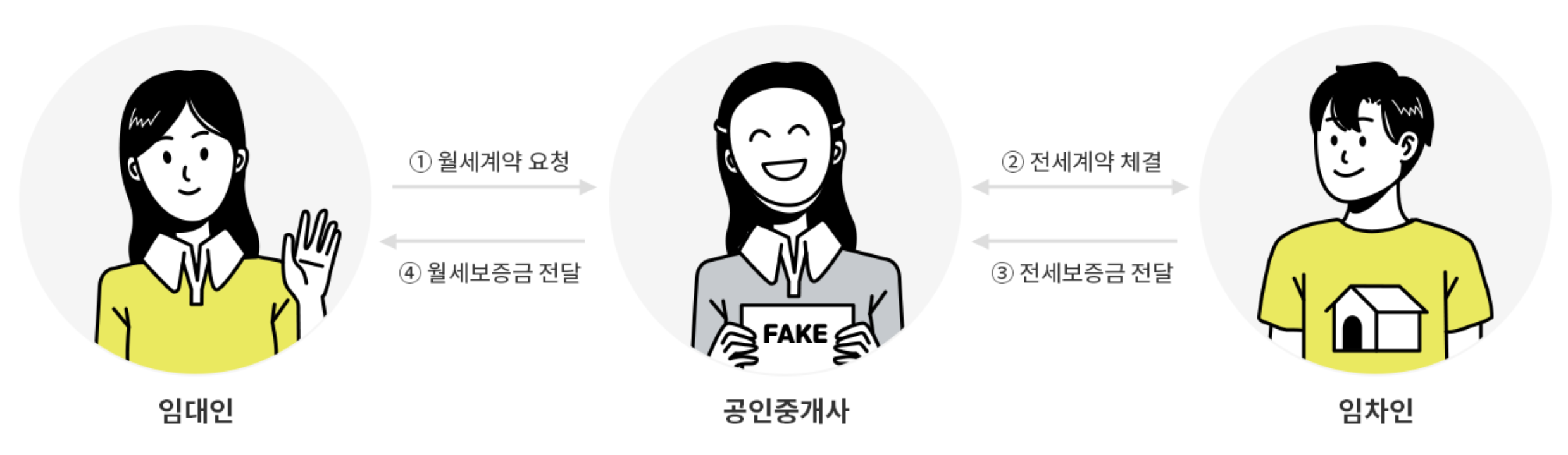 공인중개사가 임대차 거래할때 사기를 치는 유형입니다. 공인중개사가 임대인의 대리인으로 임대차 계약을 맺는 상황인데, 이 틈을 타 대리인 관련 서류를 준비하지 않고 임대인과 임차인 사이에서 월셋집을 전셋집으로 둔갑시키는 상황이 발생합니다. 예를들어, 임대인은 공인중개사에게 월세 계약을 요청하고, 공인중개사는 임차인에게 전세 계약을 체결해서 전세보증금을 빼돌리는 방법입니다.