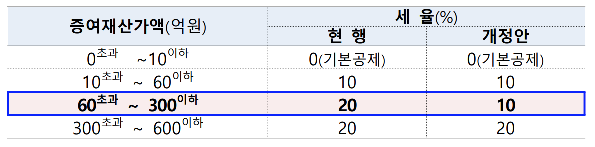 가업승계 시 가업승계 증여세 구간을 개정했습니다. 기존에는 증여재산가액이 10억~60억은 세율이 10%, 60억~600억은 세율 20%를 적용했었는데요, 개정안에서는 구간을 하나 더 만들어서 60억~300억은 세율이 10%로 만들었습니다. 가업승계 시 세부담을 줄여서 산업구조 변화에 유연하게 대응할 수 있도록 하기 위함입니다.
