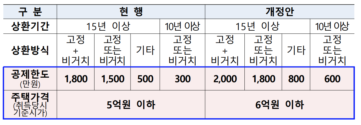 주택담보대출 이자부담을 경감하기 위해 장기주택저당차입금 이자 상환액 소득공제 한도를 확대합니다. 기존에 5억원 이하의 주택을 취득하는 경우에 주택담보대출 이자상환액 소득공제를 해주었는데요, 개정안에서는 주택가격이 6억 이하로 상향 되었습니다. 또한 상환기간과 상환방식에 따른 공제한도도 확대되었는데요, 개정안에서는 최대 2,000만원까지 공제가 됩니다.