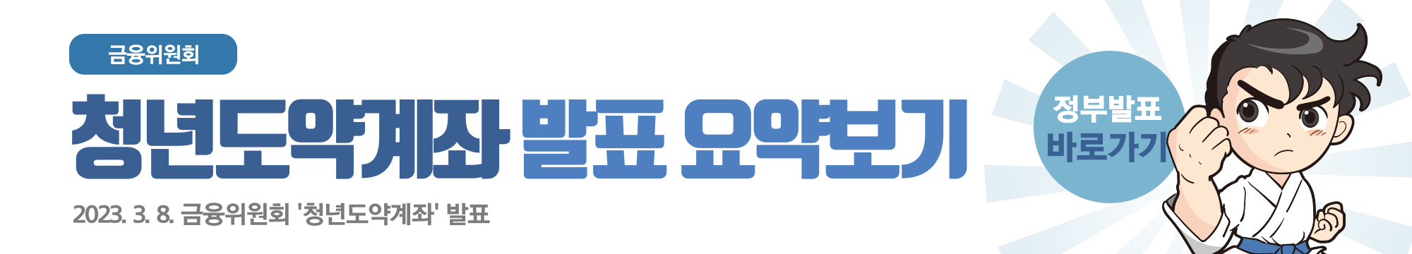 정부의 주요 국정과제인 청년 자산형성 지원을 위해 윤석열 정부의 청년도약계좌가 23년 6월부터 출시됩니다. 청년도약계좌는 윤석열 대통령이 공약으로 내세웠던 청년지원 정책 중 하나인데요, 드디어 그 세부내용들이 나오고 있습니다. 청년도약계좌의 가입조건과 신청방법, 지원금, 금리 등이 어떻게 설정이 되고 있는지 간단하면서도 핵심만 뽑아서 설명드리겠습니다.
