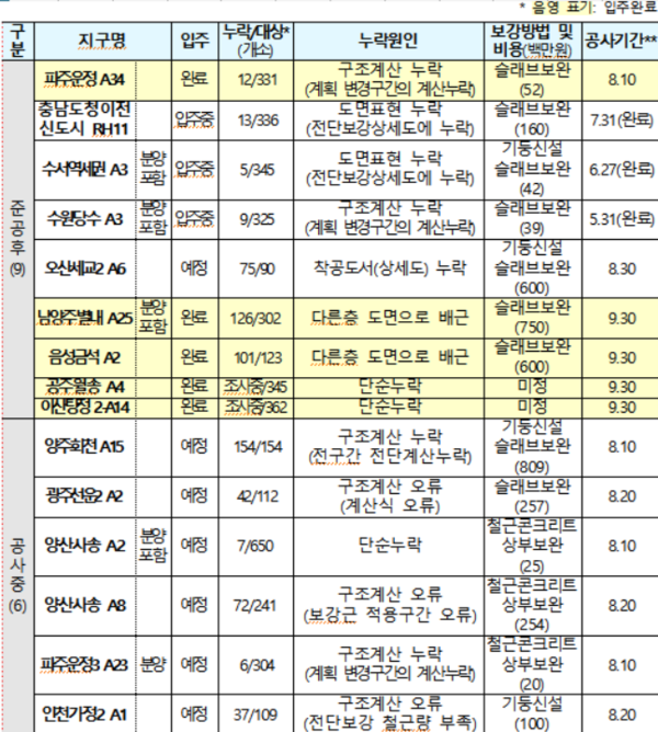 LH에서는 최근 건설한 아파트 중 무량판 구조를 적용한 91개 아파트 단지에 대해 안전 점검을 실시했고, 이 중 15개 단지에서 전단보강근이 누락된 것으로 밝혀졌습니다. 15개 단지에서 철근 등이 누락된 것으로 밝혀졌지만, 이 중 9개 단지는 이미 공사가 완료된 상황이기도 합니다. 지역별로 보면 서울, 수도권 등 8곳과 지방 7곳이며, 양주회천 A15의 경우에는 철근 전체가 누락되는 말도 안되는 상황까지 발견되었습니다.